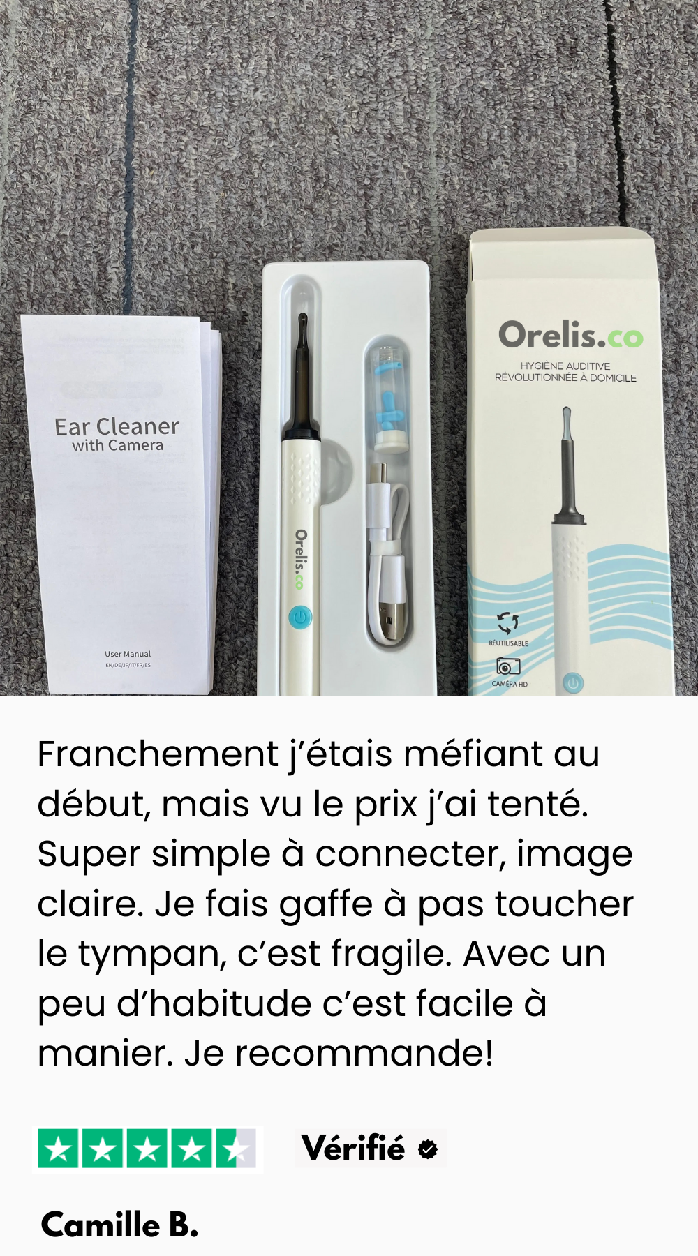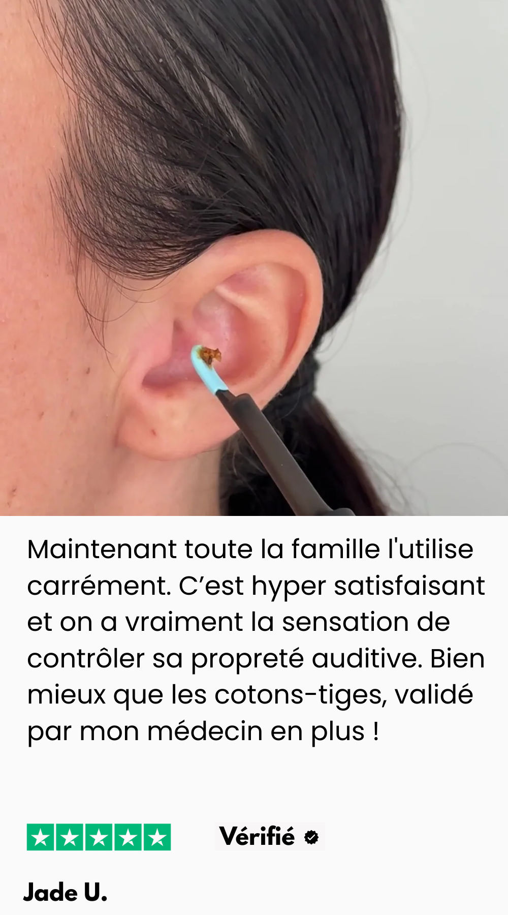 « Nettoyage beaucoup plus propre qu’avec des cotons-tiges. Aucune gêne, aucun risque pour le tympan. Très satisfaite du résultat ! »